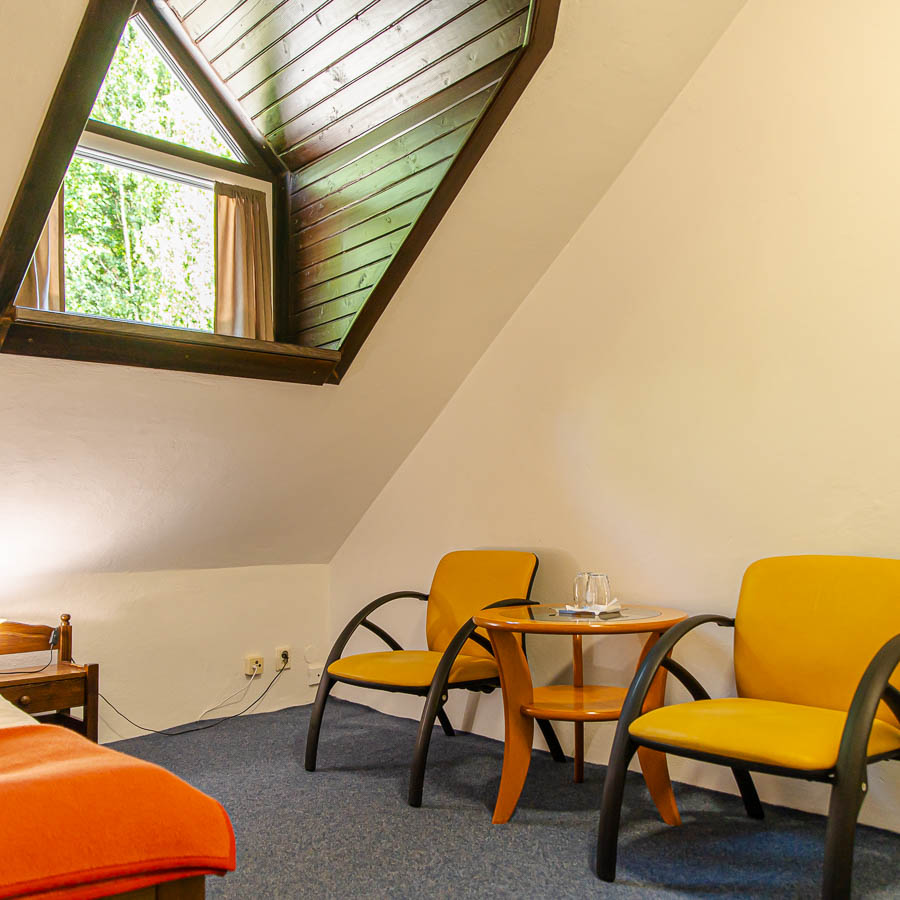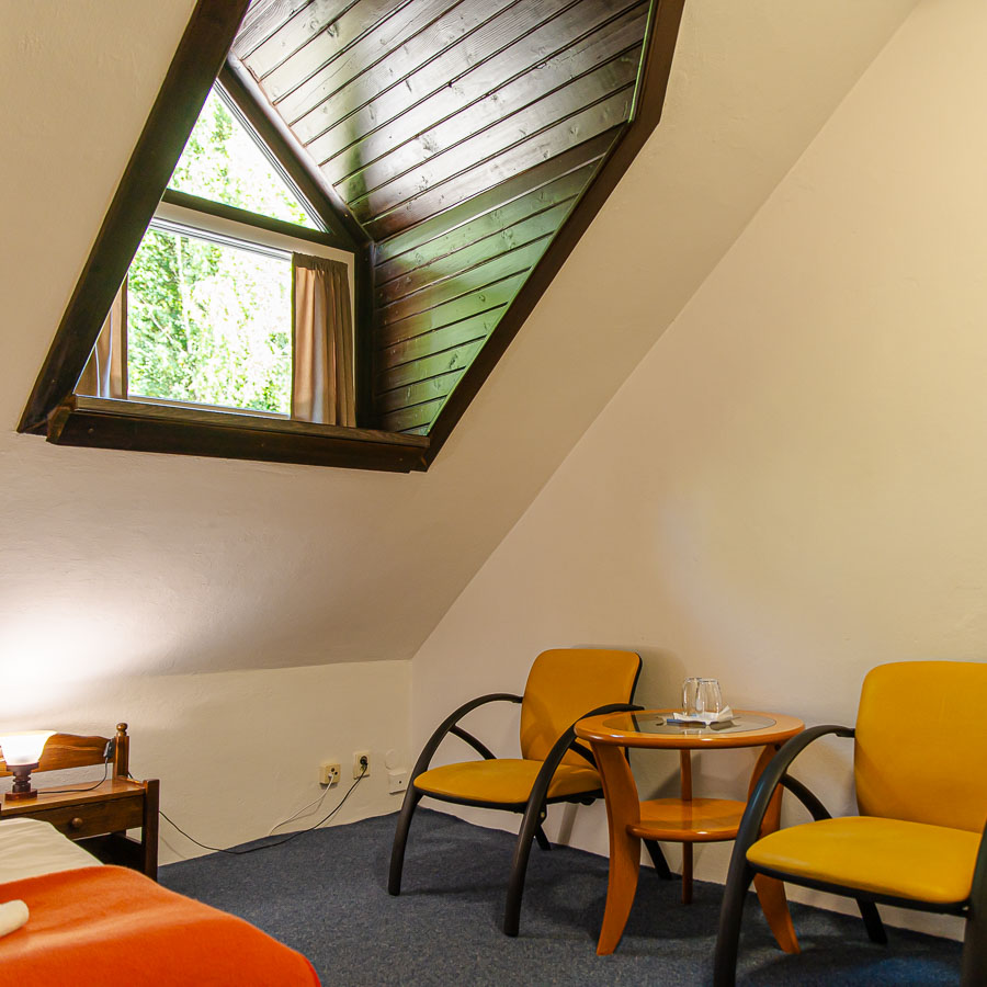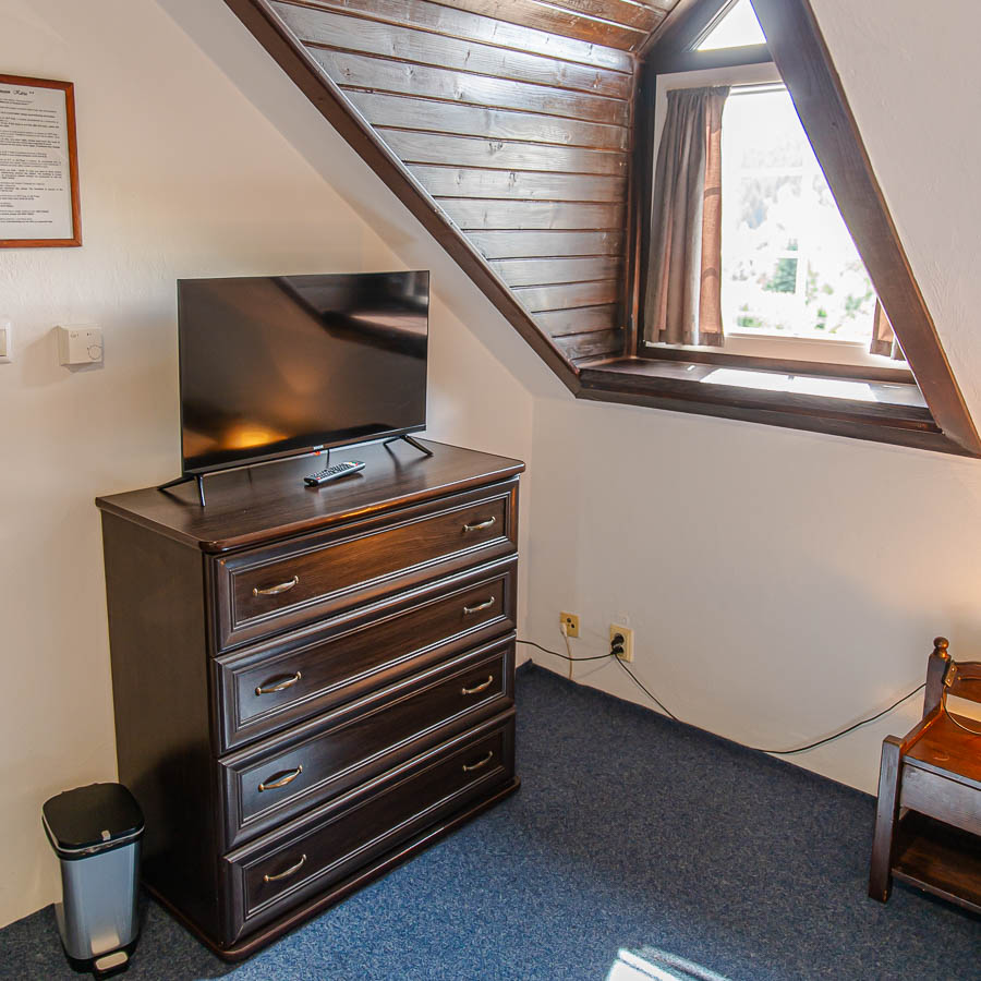 Priestranná izba ladená v príjemnom vidieckom štýle ponúka komfortnú manželskú posteľ a jedno samostatné lôžko. Súčasťou izby je vlastná kúpeľňa s toaletou, kde sú pre hostí pripravené uteráky, osušky, šampón a mydlo. K dispozícii je tiež televízor a bezplatné WiFi pripojenie na internet, aby ste sa počas pobytu cítili ako doma.